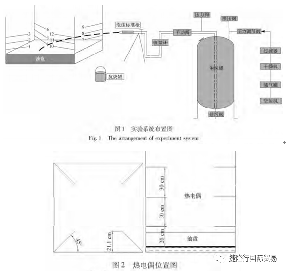 实验分别在都江堰(海拔700m)和康定机场(海拔4290m)的实验室室内进行。实验系统主要由泡沫发生系统、泡沫喷射系统和测试系统组成。其中泡沫发生系统由空压机、储气罐、干燥机、过滤器、压力调节阀和泡沫罐组成。喷射系统由压力阀、手动阀、流量计和泡沫枪组成。油盘采用的是0.8m2的圆形油盘,深度为15cm。图1为整个实验系统的仪器布置图,图2为热电偶布置图。1~12是热电偶,其中1、4、7、10号热电偶距离油面200mm,热电偶间距为300mm。无纸记录仪每1s采集一次热电偶数据。