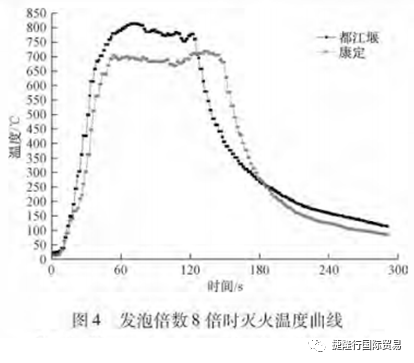 图4和图5所示为AFFF发泡倍数8倍和11倍时都江堰和康定灭火实验的温度曲线对比。