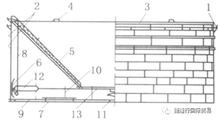 1—抗风圈;2—加强圈;3—包边角钢;4—泡沫消防挡板;5—转动扶梯;6-密封圈;7—加热器;8—量油管;9—底板;10—浮顶立柱;11—排水折管;12—浮船;13—单盘板。