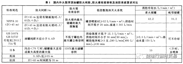 适当的防火间距是降低着火罐辐射热对邻罐威胁的有效措施之一,不同国家的气候和消防技术条件存在差异,储罐防火间距的设定依据也各不相同。通常确定防火间距需考虑四个要素:着火油罐能否引起相邻油罐爆炸起火;满足消防操作要求;采取的消防设施能力;经济成本。经济成本是影响美国防火间距设定的根本因素,以NFPA和API防火规范体系为主;日本没有强制性的储罐防火间距规定,根据业主的不同而有所不同,通常为1D;欧洲没有明确指出防火间距的设定原则,但对储罐之间最小防火间距给出了相关建议,要求储罐全液面火灾场景防火间距能够防止发生倾斜的火焰接触到邻近储罐,且满足消防员对邻近储罐进行冷却作业的空间需求。我国GB50737~2011《石油库储备库设计规范》、GB50160《石油化工企业设计防火规范》等规范要求对于大型浮顶储罐防火间距不应小于0.4D(D为最大罐直径)。对于大型浮顶油罐区,消防冷却水可以冷却着火储罐和周邻储罐,有效降低热辐射危害,起到类似于防火间距的防护作用。罐区储料一旦大量泄漏,防火堤有效容积是防止大规模流淌的主要措施。对于油类储罐,多采用低倍数泡沫灭火系统。表1给出了各国对大型外浮顶储罐防火间距、防火堤有效容积、低倍数泡沫供给参数和消防冷却水等的不同要求。其中,[ ]内为石化安[2011]754号要求。由表1可以看出,对于大型浮顶油罐,我国防火间距的要求低于美国和日本;防火堤有效容积与美国相当,略低于日本;低倍数泡沫灭火系统的泡沫混合液供给强度和供给时间略高于NFPA 30的要求,但石化行业的供给时间提高了1倍。NFPA 30对于设置了储液池的着火储罐和毗邻储罐需要消防冷却水,且供给量很大,防火间距为1/4(D1+D2)时通常不需要冷却。我国仅对着火油罐进行消防水冷却,毗邻罐可不冷却,但冷却水供给强度低于日本和法国。为此,要基于火灾风险分析优化设计罐区的防火间距、防火堤容积及低倍数泡沫灭火系统和消防冷却水系统的配置。