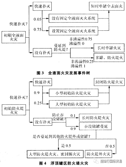 从大型油罐泄漏模式看,主要是罐顶泄漏、沉顶、罐壁或管道泄漏;从初期火灾类型来看,主要是密封圈火灾、浮顶泄漏火灾、防火堤内火灾、沉盘全表面火灾等,其中密封圈火灾是主要事故类型,机械故障是罐顶泄漏的主要事故模式。LASTFIRE项目收集了198119952420座直径大于40m的外浮顶储罐运行33909(罐·年)的事故数据,单罐密封圈火灾、浮顶泄漏火灾、防火堤内小火、防火堤内大火及部分或全液面火灾的年发生事故频率分别为1.0×10-33.0×10-59.0×10-56.0×10-53.0×10-5。从罐区火灾场景发展趋势来看,任何初期火灾场景,若不能有效控制和扑救,都有可能演化为单罐或多罐全液面火灾。笔者基于案例统计分析给出初期火灾场景的发展事件树,如图1~图4所示。