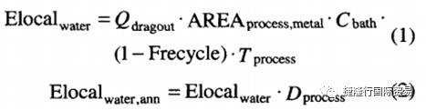 向水中排放的计算根据OECD金属加工排放情景文件,见式(1),式(2).当金属离开处理槽时,溶液残留于金属之上,这个过程叫做带出。向水中的排放主要来源于带出。排放量根据处理池中PFOS浓度、单位时间处理金属量、单位面积金属带出溶液量、带出溶液回流百分比和车间运行时间计算。